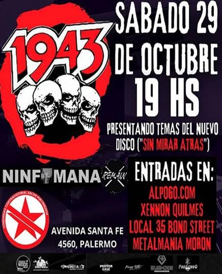 1943, los legendarios punks rockers quilmeños presentarán los temas de su nuevo disco “Sin mirar atrás” en el que será su último show del año en C.A.B.A., el próximo sábado 29 de octubre en el “Salón Pueyrredon”, Av. Santa Fe 4560, Palermo.