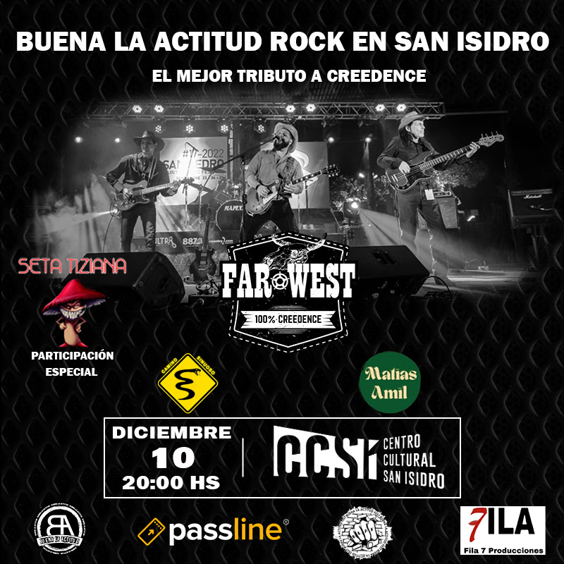 Esta edición de Buena la actitud rock en San Isidro, con producción de Fila 7 producciones y BLA producciones, contará con la participación estelar de Far West (100% Creedence), junto a Seta Tiziana, Camino Sinuoso rock y Matías Amil.