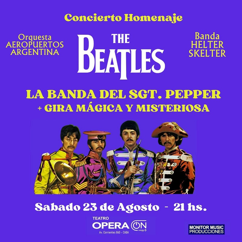 El próximo sábado 23 de agosto se realizará un concierto homenaje a la obra cumbre de THE BEATLES. Con la Orquesta Aeropuertos Argentina y la banda Helter Skelter se celebrará la Banda del Sgt. Pepper y Gira Mágica y Misteriosa en un evento único en el Teatro Opera.