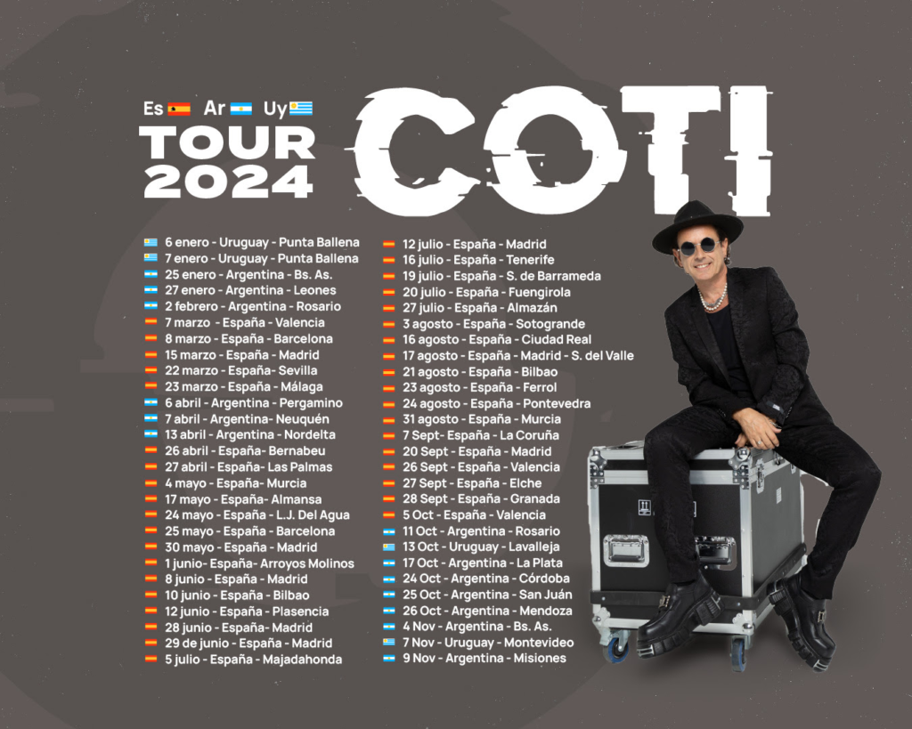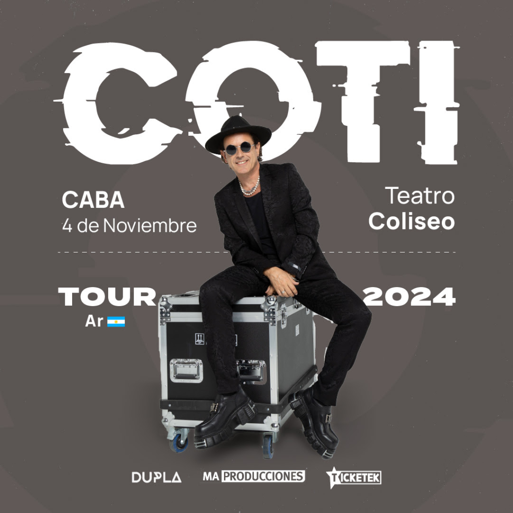 El artista viene de una intensa serie de conciertos (más de 30) en España, país que lo recibe siempre con los brazos abiertos y gran cariño. El vínculo con su público español sigue fortaleciéndose año tras año, confirmando a Coti como uno de los músicos más queridos en ambos lados del Atlántico.Este 4 de noviembre Coti promete una noche con momentos de energía así como también segmentos más íntimos y el teatro Coliseo es el escenario perfecto para vivir esta experiencia.