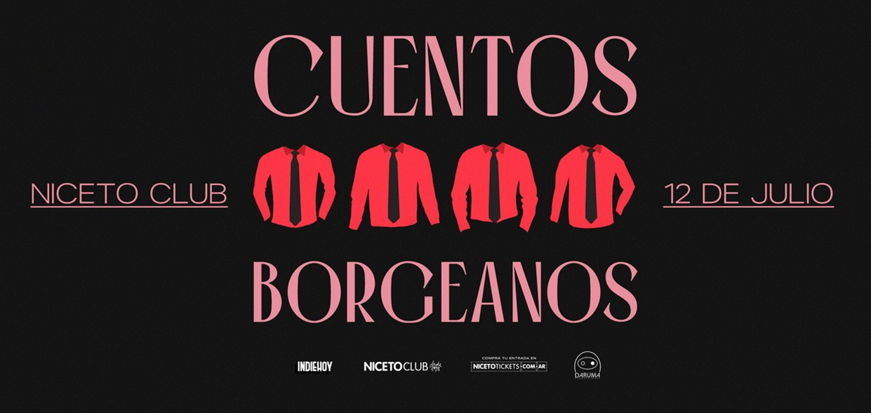 Cuentos Borgeanos reúne, luego de 15 años y por ÚNICA VEZ, a su formación original: Abril Sosa, Diego López Santana, Agustín «Búho» Rocino y Lucas «Gato» Hernández.«Sin tiempo ni final» es una celebración, un reencuentro que se dará el sábado 12 de Julio de 2025 a las 21 hs. en Niceto Club.Las entradas están a la venta en Passline.Evento apto para mayores de 18 años.