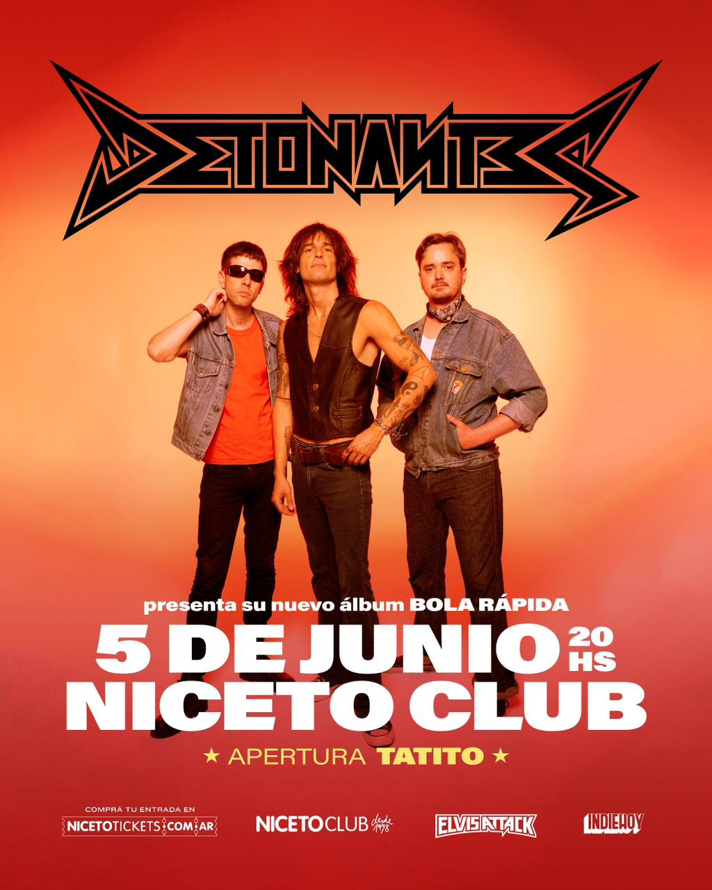 DETONANTES presenta su nuevo disco Bola rápida en Niceto Club. El 5 de junio, la banda regresa a los escenarios para presentar su primer material después de 10 años. Las entradas ya se pueden conseguir a través de Passline. La apertura estará a cargo de Tatito, que llega desde el Oeste para tocar las canciones de su debut, La espina, y presentar nuevo material.