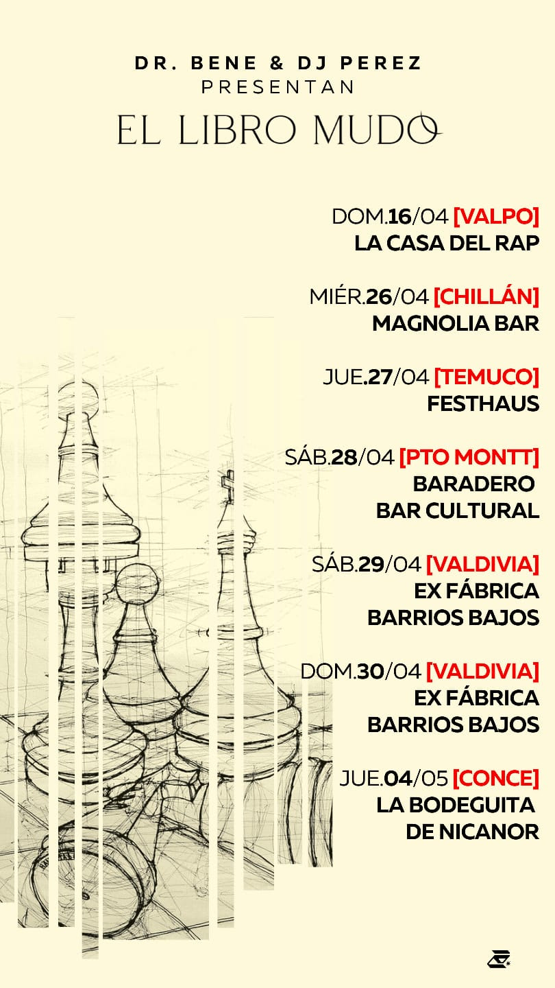 Tras realizar un exitoso show de lanzamiento en Santiago el 31 de marzo, Dr. Bene se prepara para presentar el nuevo álbum en distintos escenarios de Chile. La gira comenzará el domingo 16 de abril con un concierto en La Casa del Rap, en Valparaíso, y continuará con shows en Chillán, Temuco, Puerto Montt, Valdivia y Concepción.