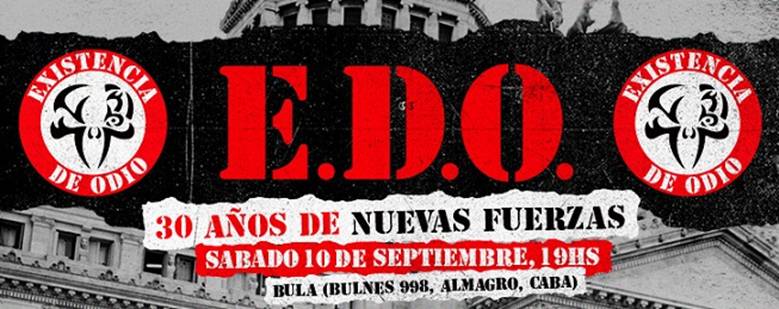 E.D.O. (Existencia de Odio) la banda pionera del Hardcore en Argentina celebrará los 30 años de su emblemático disco “Nuevas Fuerzas” el próximo sábado 10 de septiembre a las 19.00 horas en “Bula”, Bulnes 998, Almagro, C.A.B.A.