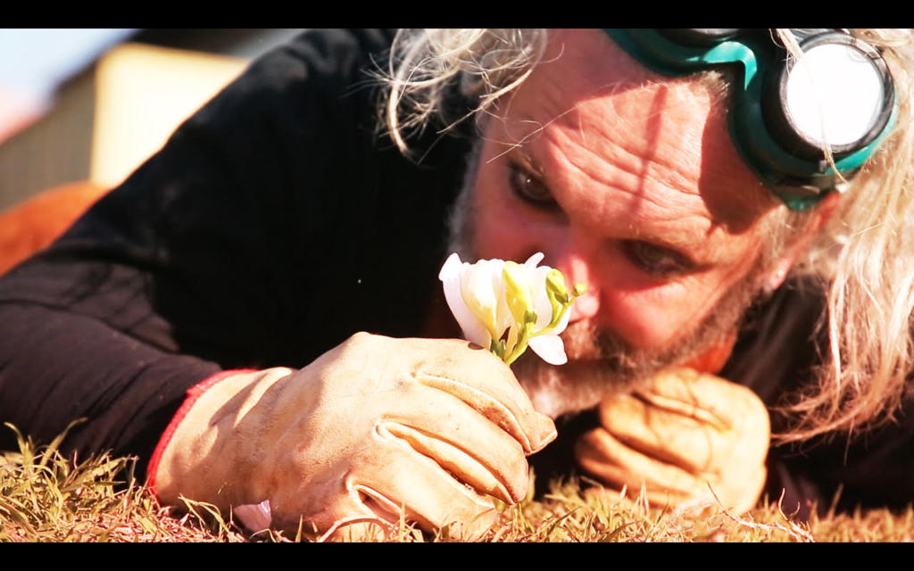 El actor (Inairam) también ejerce el oficio, y la construcción del personaje (H) se basó en ello. La rudeza de los hierros y la soldadura en contraste con la fragilidad de una flor. La pelea interna proyectada en esos dos elementos. ¡H deberá decidir!