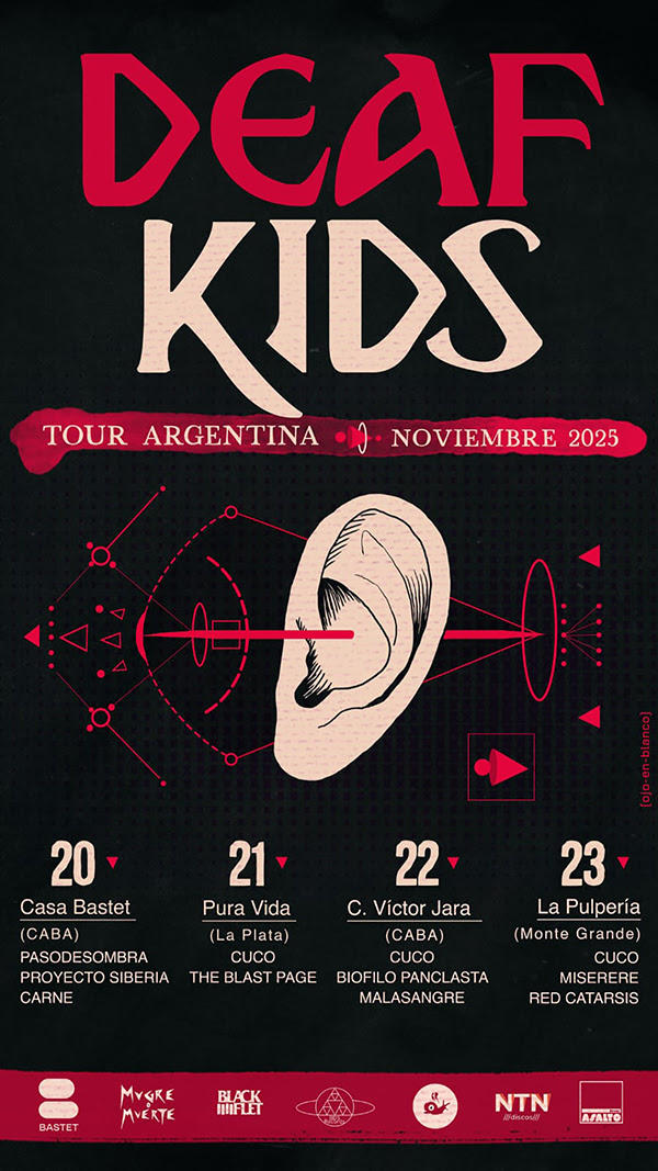 Steve Von Till, del sello Neurot Recordings, define a DEAFKIDS como “ayahuasca sónica”, refiriéndose a su trance polirítmico, furioso y distorsionado. Esa experiencia podrá vivirse en Buenos Aires en sus cuatro presentaciones: 20/11 en C.A.B.A. con un set íntimo y experimental; 21/11 en La Plata; 22/11 nuevamente en C.A.B.A. en formato eléctrico atronador; y el cierre el 23/11 en Monte Grande. Todos los recitales además serán compartidos con destacados grupos locales como CUCO (principales impulsores de la gira de DEAFKIDS por Argentina), PASODESOMBRA, MISERERE y BIOFILO PANCLASTA, por solo nombrar algunos. Cuatro oportunidades para que el ruido, ritmo y rebelión de DEAFKIDS hagan vibrar Buenos Aires.