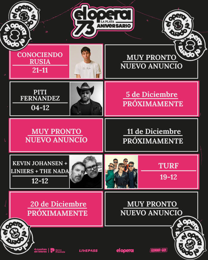 Los primeros anuncios son: Conociendo Rusia dirá presente el próximo 21 de noviembre en el marco de gira nacional, mientras que en diciembre Piti Fernández se presentará el día 4, Kevin Johansen + Liniers + The Nada se suman el 12 y Turf hará lo propio el 19 del mismo mes..