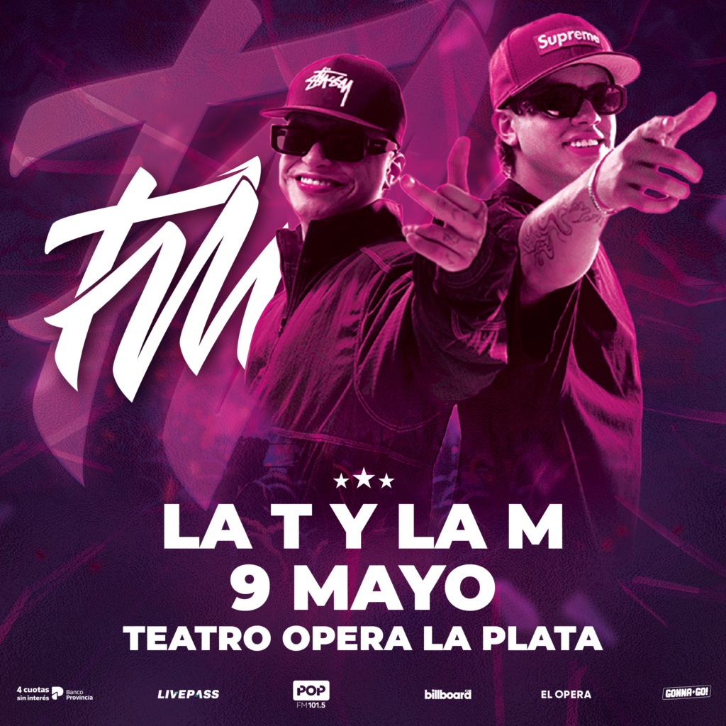 Con un gran presente Tobías Medrano y Matías Rapen, La T y La M, continúan batiendo récords de reproducciones, ahora anuncian su llegada a la ciudad de La Plata, el Teatro Ópera recibe a uno de los eventos más esperados el viernes 9 de mayo, 21hs.