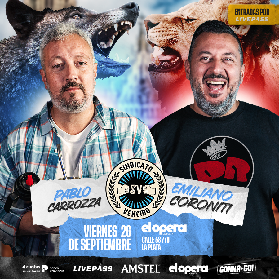 SINDICATO VENCIDO, con Pablo Carrozza y Emiliano Coroniti, es un proyecto que nació en el streaming y fue trasladado al escenario, donde los autores se ponen en la piel de los hombres vencidos, los hombres comunes.