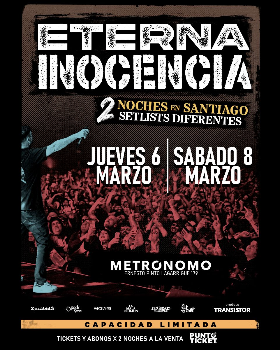 Luego de un exitoso show en septiembre pasado con localidades totalmente agotadas en Teatro Coliseo, conmemorando los 20 años de su emblemático álbum «Las Palabras y los Ríos», Eterna Inocencia regresa a Chile con una gira especial que los tendrá presentándose en Sala Metrónomo por partida doble los días 6 y 8 de marzo, con presentaciones de caracter íntimo que los tendrán interpretando dos setlists diferentes para cada noche.