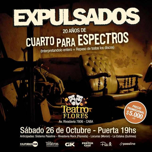 El próximo sábado 26 de octubre, la banda más representativa del punk ramone en Sudamérica, Expulsados, celebrará los 20 años de su icónico disco “Cuarto para espectros” en El Teatro Flores, ubicado en Av. Rivadavia 7806, C.A.B.A. En esta ocasión, realizarán un recorrido completo por las canciones del disco y los temas más destacados de su carrera.