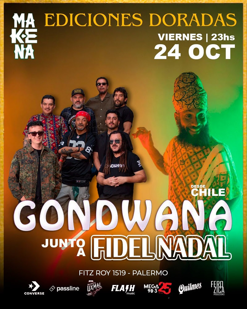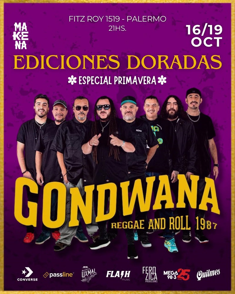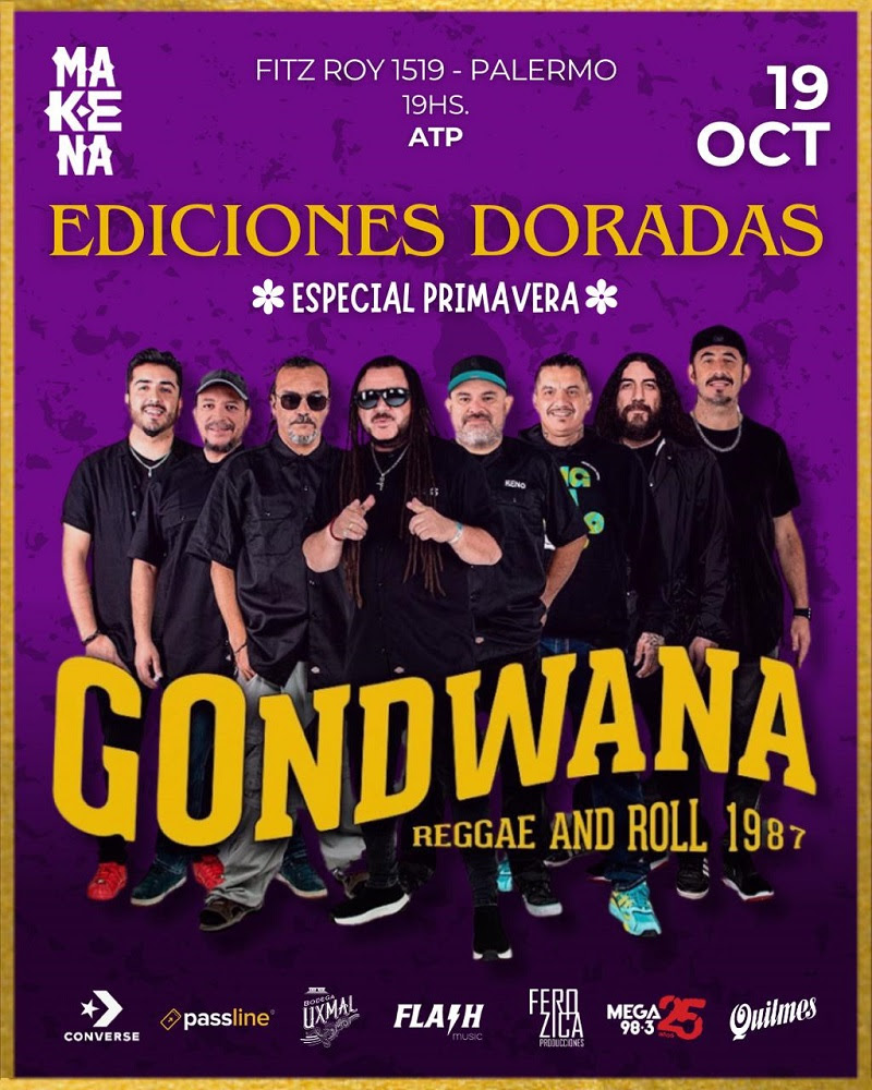 GONDWANA, la icónica banda chilena realizará tres vibrantes shows en Buenos Aires, con lo mejor de su amplio repertorio. Las citas en el marco de las Ediciones Doradas 2025 – Especial Primavera-, son este jueves 16 junto a RIDDIM, el domingo 19 (con entradas ATP), junto a HOY LILA y el próximo viernes 24 de octubre junto a FIDEL NADAL en MAKENA, Fitz Roy 1519, Palermo. Entradas en venta a través de Passline.