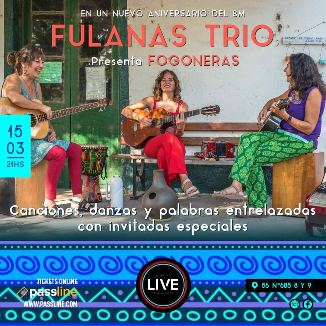 Más sobre Fulanas Trío: se formó en La Plata, en 2001. Instrumentistas, intérpretes, cantoras, con más de 20 años de camino musical, son buceadoras de un rico bagaje cultural que transmiten en cada concierto con la alegría que las caracteriza. Con arreglos propios y el respeto que impone la raíz, Fulanas recorre con fluidez un repertorio que se vuelve sentimiento colectivo de pertenencia latinoamericana.