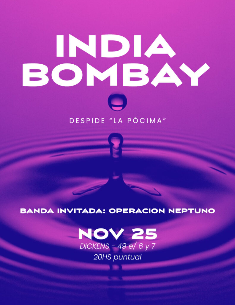 Después de un show con entradas agotadas en Guajira Bar en el mes de abril, India Bombay redobla la apuesta planteando una fecha autogestionada al %100 para una cantidad de 600 personas, buscando un lugar diferente en la escena platense. Las entradas pueden adquirirse digitalmente, a través del Instagram de India Bombay.
