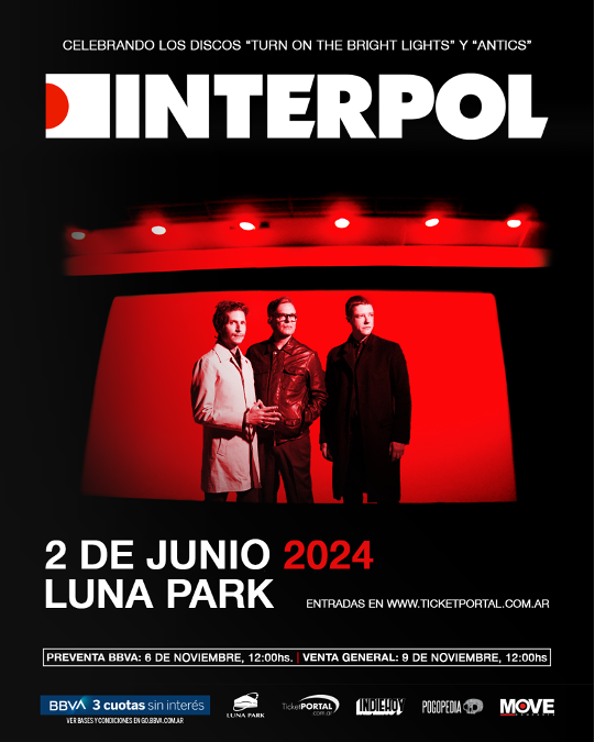 La banda neoyorquina regresa a Argentina para tocar todos éxitos de sus principales y más exitosos álbumes que los catapultaron a la fama: Turn On The Bright Ligths y Antics. Se presentarán el 2 de Junio en el mítico estadio Luna Park y los clientes BBVA tendrán una preventa exclusiva y 3 cuotas sin interés a partir del lunes 6 de noviembre a las 12 hs. La venta general comenzará el jueves 9 de noviembre a las 12 hs. Las entradas estarán disponibles únicamente a través de Ticketportal.com.ar . Luego de dos años de estar girando, la banda ingresa a los estudios para grabar su segundo álbum que se tituló ¨Antics¨ y fue lanzado en el año 2004 vendiendo 488 000 copias en el Reino Unido y 100,000 en los E.U.A y es más confidente que su predecesor Turn on the bright lights en este álbum emplean la misma fórmula; bajos definidos, batería fuerte y guitarras distorsionadas, con una vaga, evocativas letras y cantadas por la resonante voz del vocalista Paul Banks. Musicalmente hablando este álbum es más positivo que su oscuro predecesor. Estuvo en el Top 10 de la lista de la música más criticada en el año 2004. Su álbum debut de Turn On the Bright Lights (2002) es una declaración de intenciones totalmente realizadas, las canciones de este disco son un triunfo de la melancolía y la fuerza juvenil. Turn on the Brigh Lights fue aclamado por la crítica, llegando a la décima posición en la lista de NME de los mejores álbumes de 2002 y número uno en los 50 mejores álbumes de Pitchfork Media de 2002. |