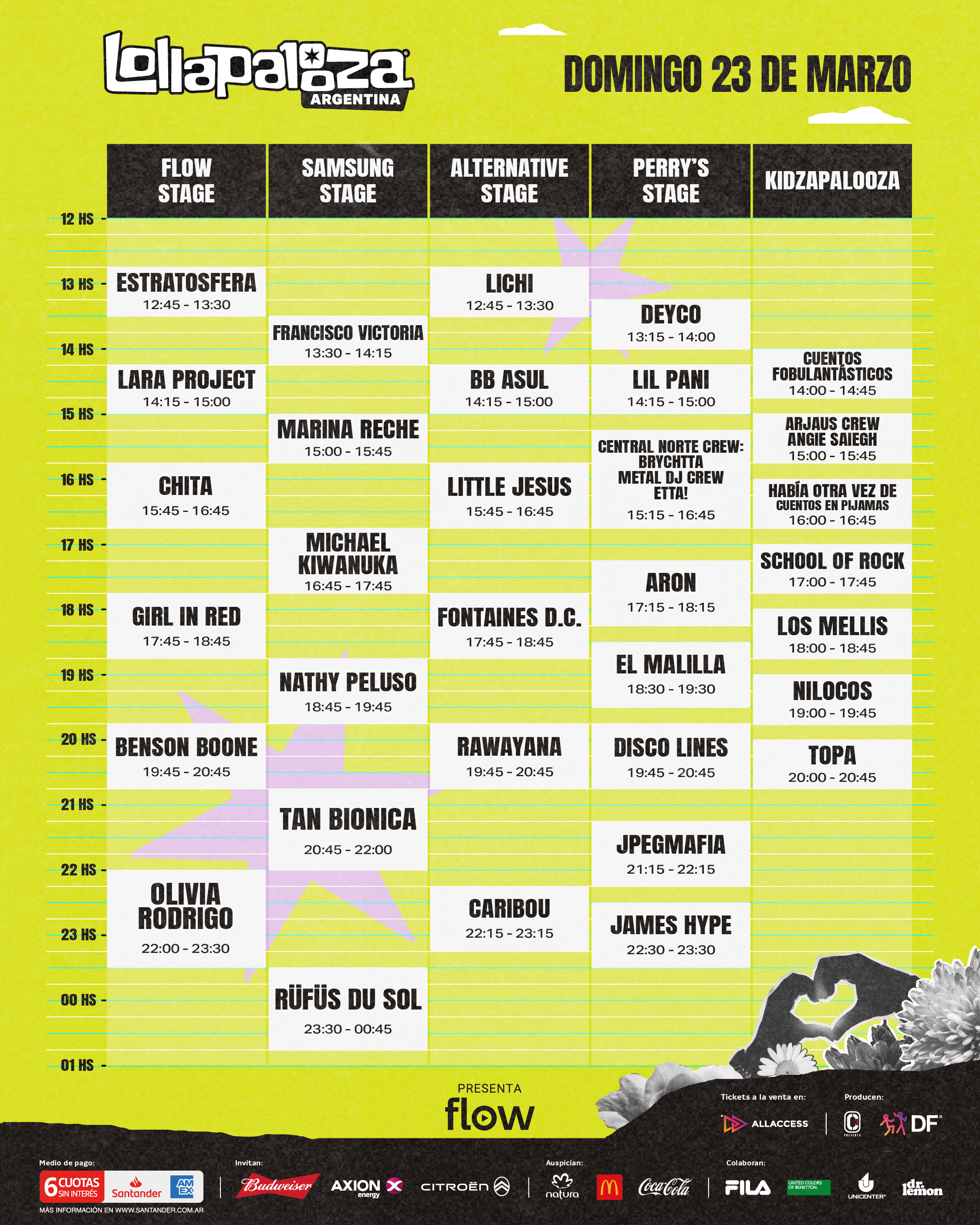 Además de los conciertos, el público podrá recorrer los distintos sectores del festival, como LollaFood, que ofrecerá una selección gastronómica con opciones para todos los gustos, Kidzapalooza, el espacio pensado para los más pequeños con actividades interactivas y shows especialmente diseñados para ellos, y Espíritu Verde, una iniciativa que promueve el compromiso ambiental y la sostenibilidad a través de diversas acciones ecológicas.