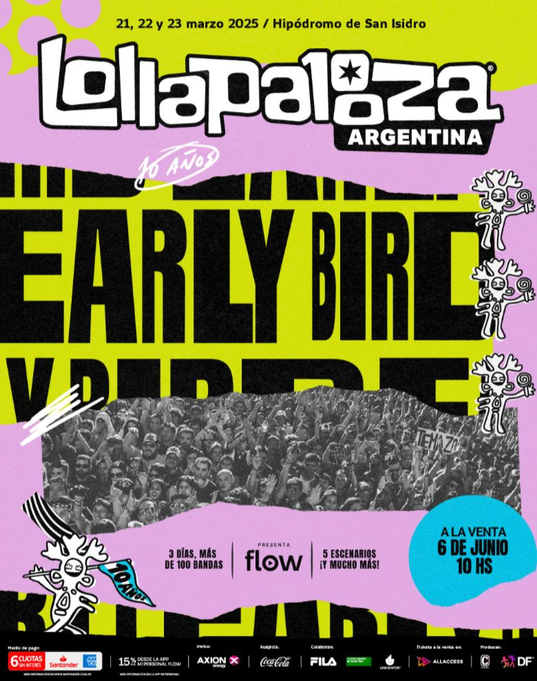 Junio marca la mitad del año y, como ya es costumbre a esta altura del calendario, llega el momento para los fans históricos y habituales del Lollapalooza: ¡Llegaron los Early Bird! Como su nombre lo indica, son las entradas para quienes saben que cuanto antes, mejor. Los Early Bird son abonos para vivir Lollapalooza Argentina 2025 –una edición imperdible por la celebración de sus 10 años en el país– de principio a fin y a un precio insuperable de $120.000 + service charge. Esta etapa de venta abre hoy a las 10 a.m. únicamente a través de All Access, y continúa por 48 hs o hasta agotar stock, donde se pasará automáticamente a la etapa Preventa 1 y así sucesivamente a las siguientes etapas de venta.
