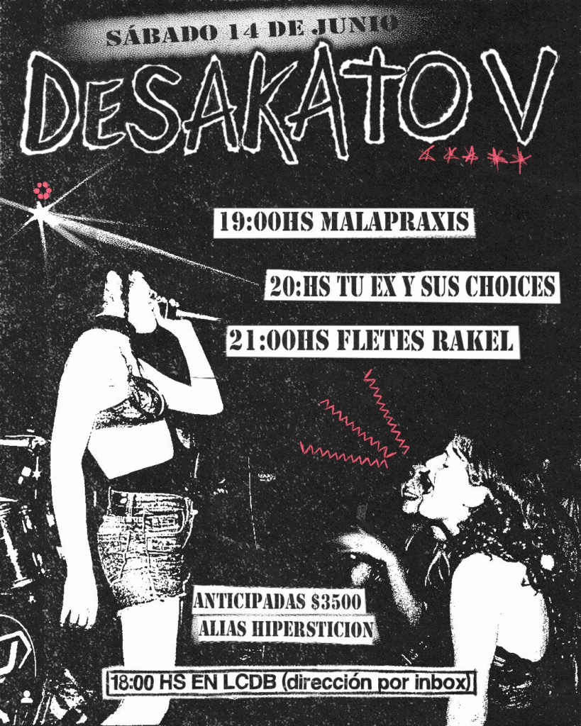 El próximo sábado 14 de junio se llevará a cabo la quinta edición del festival Desakato en La Cultura del Barrio (Villa Crespo). El evento reúne proyectos musicales conformados por mujeres, lesbianas, maricas, travestis y trans de diversos géneros musicales con énfasis dentro del rock alternativo. En esta edición participarán Malapraxis, Tu Ex y Sus Choices y Fletes Rakel. Habrá feria de fanzines, ilustraciones, emprendimientos y flash tatoo.