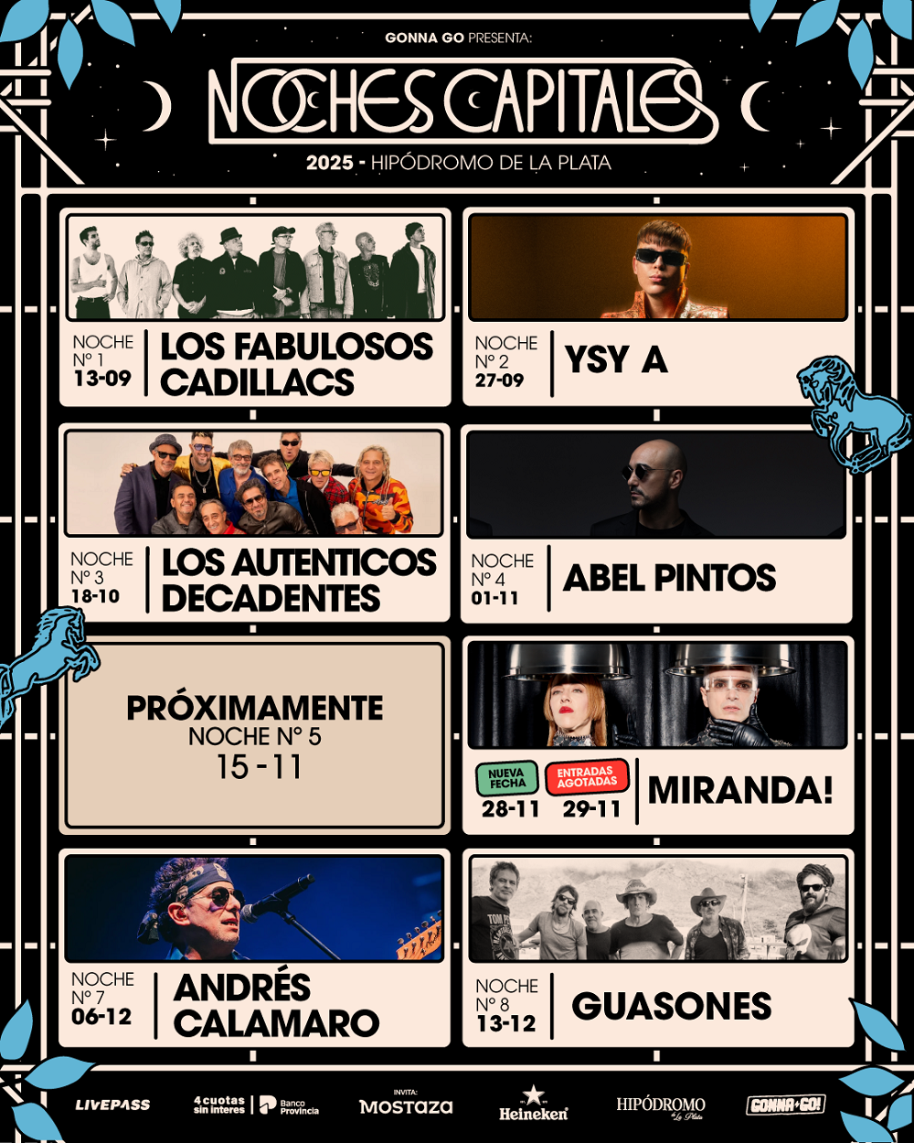 La grilla ya es monumental: Los Fabulosos Cadillacs el 23 de septiembre, YSY A el 27 de septiembre, Los Auténticos Decadentes el 18 de octubre, Abel Pintos el 1 de noviembre, Miranda! el 29 de noviembre, Andrés Calamaro el 6 de diciembre y Guasones el 13 de diciembre. Y la expectativa continúa creciendo más firme que nunca con el sorprendente anuncio de la nueva fecha de Miranda! para el día 28 de noviembre. Talentosos y consagrados músicos que se encuentran celebrando trayectorias, estrenando materiales y marcando el pulso de la escena artística.