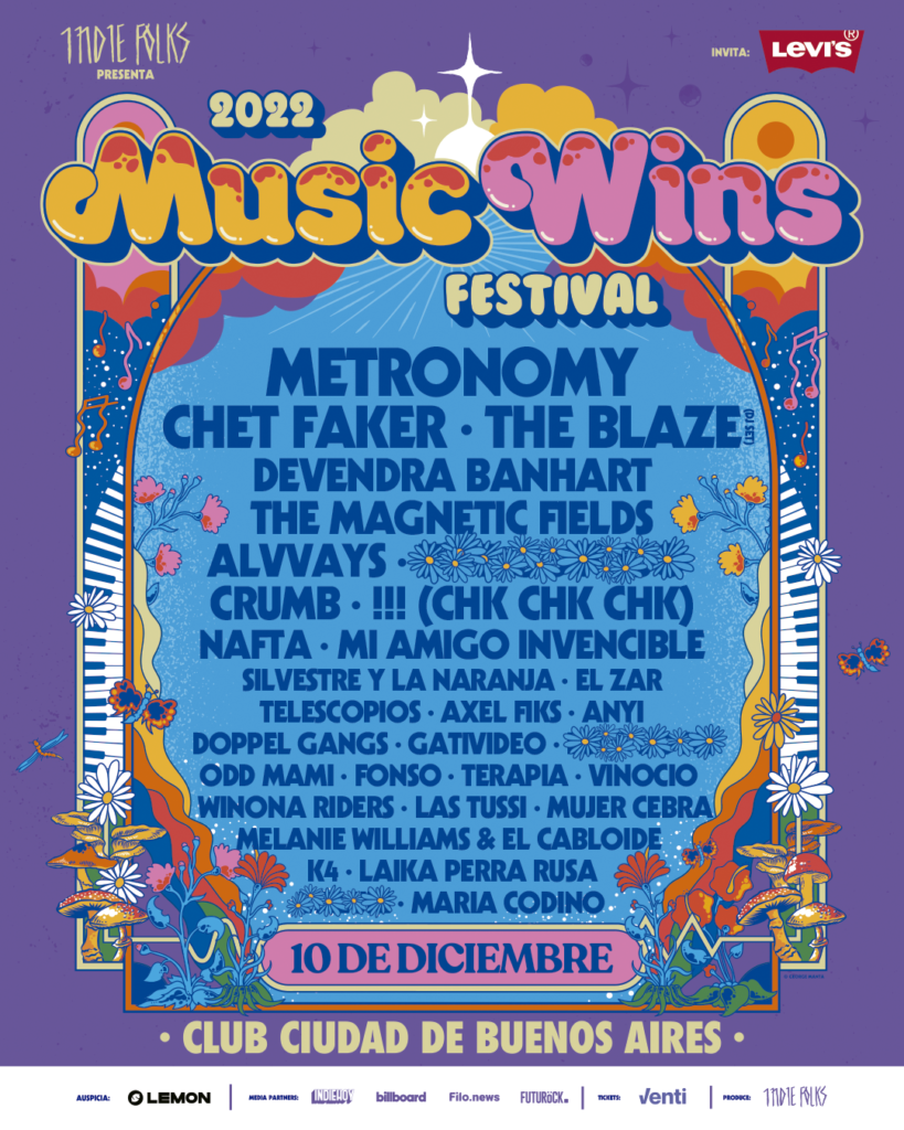 El festival más querido por la escena independiente argentina ya es una realidad y está a la vuelta de la esquina. Music Wins Festival 2022 contará con un line-up de lujo donde figuran Metronomy, Chet Faker y The Blaze como atracciones principales. Devendra Banhart, The Magnetic Fields, Alvvays, !!! (Chk Chk Chk) y Crumb completan el cartel internacional. El line up se completa con lo mejor de la escena nacional, y se suman al cartel bandas nacionales de la talla de NAFTA, Mi Amigo Invencible, Silvestre y La Naranja, El Zar y muchas más. El festival tendrá lugar en el Club Ciudad de Buenos Aires el sábado 10 de diciembre, y las entradas ya están a la venta en venti.com.ar.