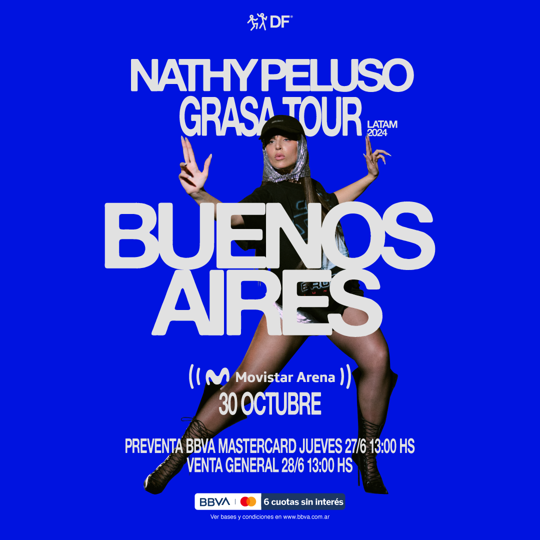 Controversial, osada, romántica, empoderada, desprejuiciada y siempre divertida, nadie lo hace exactamente cómo Nathy Peluso, una fuerza en sí misma dentro de la escena de la música actual. La artista argentina radicada en España viene de estrenar su tercer disco de estudio, GRASA, donde profundiza su particular alquimia de géneros, combinando rap, R&B, baladas, música tropical y pop dosmilero, por nombrar algunos. A poco tiempo del lanzamiento, llegó la noticia que esperaban sus fans de estas latitudes: Nathy Peluso estará presentando GRASA en Movistar Arena, el 30 de octubre, con producción de DF Entertainment.
