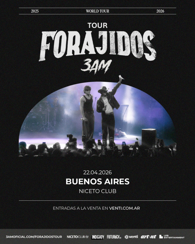 Luego de sus exitosas visitas a Buenos Aires, el dúo 3AM anuncia su esperado regreso al país y confirma que su show del 22 de abril cambia de lugar y se realizará en Niceto Club. La fecha forma parte del FORAJIDOS TOUR, que también incluirá su primera presentación en el Quality Teatro de Córdoba el 25 de abril.