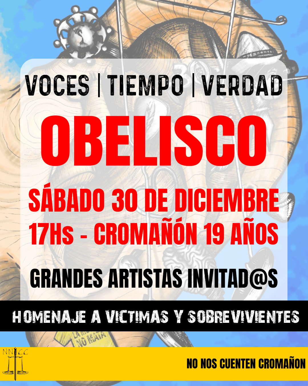 Sobrevivientes y familiares de víctimas estarán presentes el viernes 30 de diciembre en el Obelisco de la Ciudad de Buenos Aires (Av. Diagonal Norte entre Carlos Pellegrini y Suipacha, CABA), con discursos a su cargo y grandes números musicales.