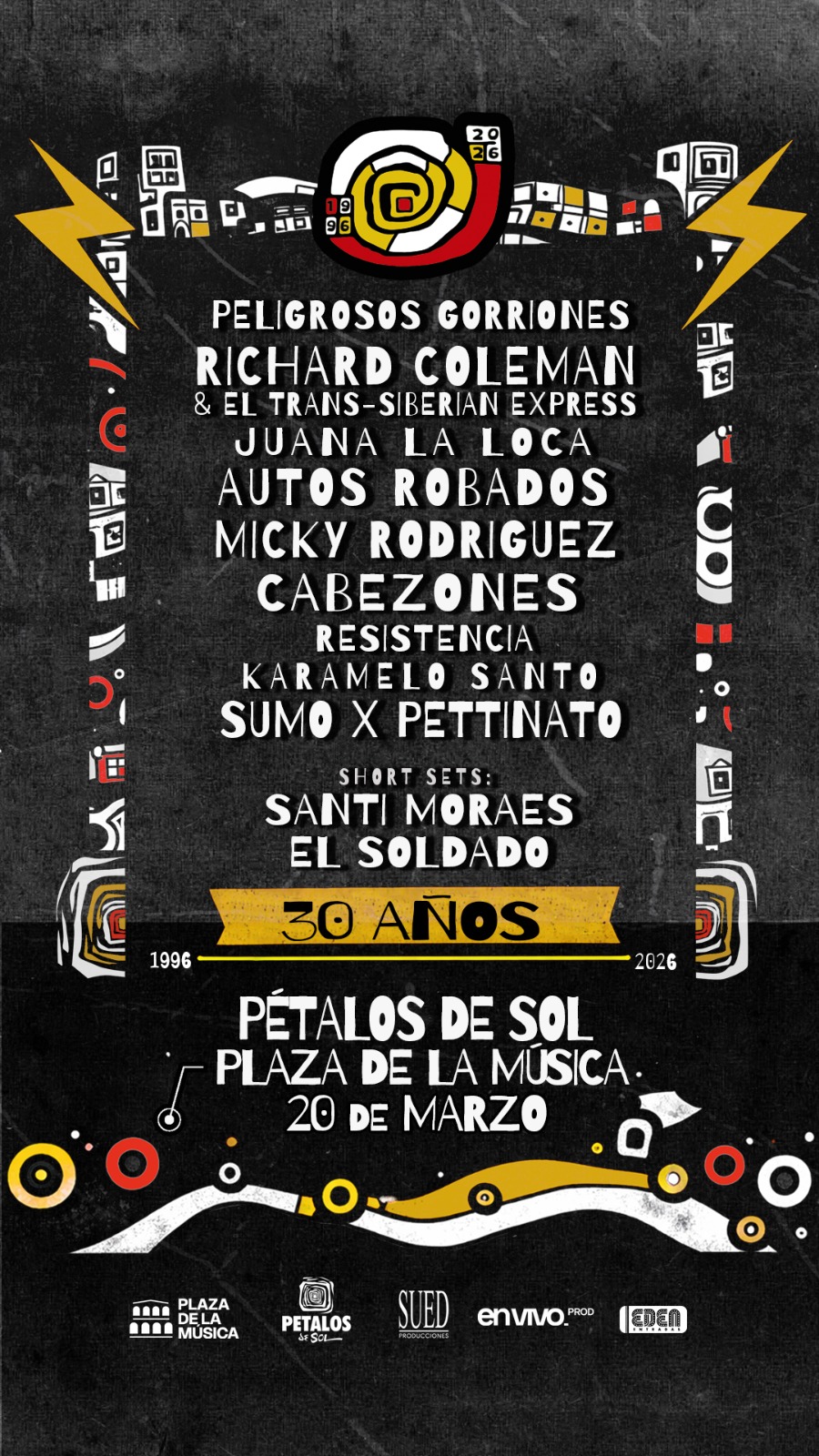 Pétalos de Sol celebrará tres décadas de vida en la Plaza de la Música. El encuentro tiene fecha para el día viernes 20 de marzo a las 22 horas. La grilla de artistas estará conformada por Los Peligrosos Gorriones, Juana La Loca, Richard Coleman & TSE, Micky Rodriguez, Autos Robados, Sumo x Pettinato, Cabezones,