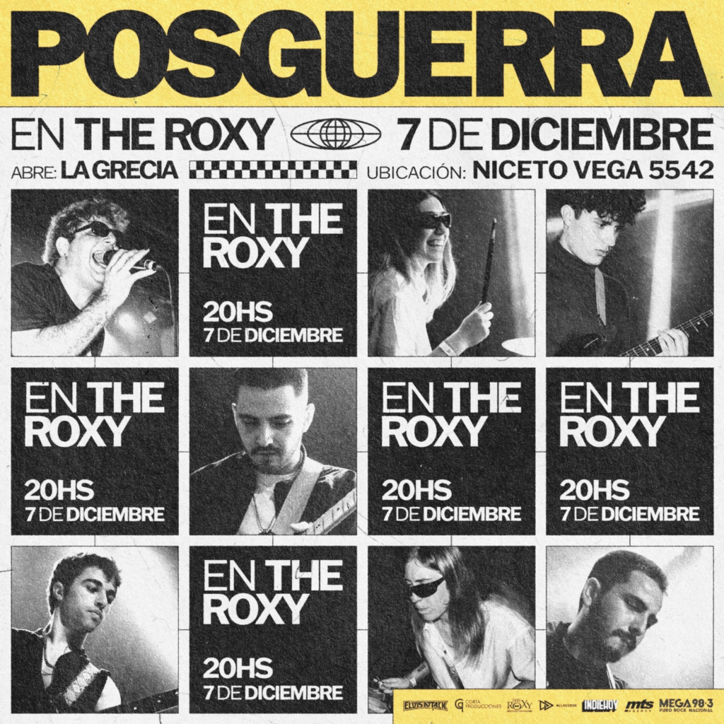 Posguerra se presentará el próximo el 7 de Diciembre en The Roxy (Niceto Vega 5542, Palermo)para cerrar el año. Con un estilo que fusiona guitarras distorsionadas, pasajes de rap enérgicos y una esencia anclada en el rock, han logrado conquistar un gran público. La banda incorpora una amplia gama de influencias, desde clásicos atemporales como Abbey Road hasta discos fundamentales como Superficies de Placer y Alta Suciedad, creando así una experiencia sonora única.