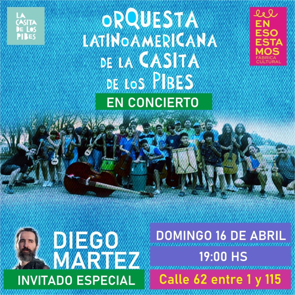 Primer concierto del año de la Orquesta Latinoamericana de La Casita de los Pibes, el día 16 de abril a las 19 hs en el Centro Cultural En Eso Estamos, ubicado en la calle 62 e/1 y 115 de la ciudad.