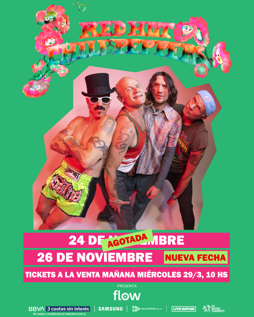 | Luego de las expectativas que surgieron cuando la inigualable banda de punk y funk anunció fechas en Brasil, Red Hot Chili Peppers hizo realidad el sueño de miles de fans y confirmó show en Argentina con su formación histórica, presentado por Flow, para el viernes 24 de noviembre en el Estadio River Plate. Los fans se hicieron eco de la noticia y agotaron la preventa exclusiva para clientes BBVA y en tan sólo tres horas, también agotaron la venta general. La buena noticia es que la banda acaba de confirmar su segundo show el domingo 26 de noviembre. Los tickets se podrán adquirir desde mañana miércoles 29 de marzo a las 10 am, ingresando únicamente en la plataforma oficial Allaccess.com.ar. Los mismos se podrán comprar en 3 cuotas sin interés para clientes BBVA. |