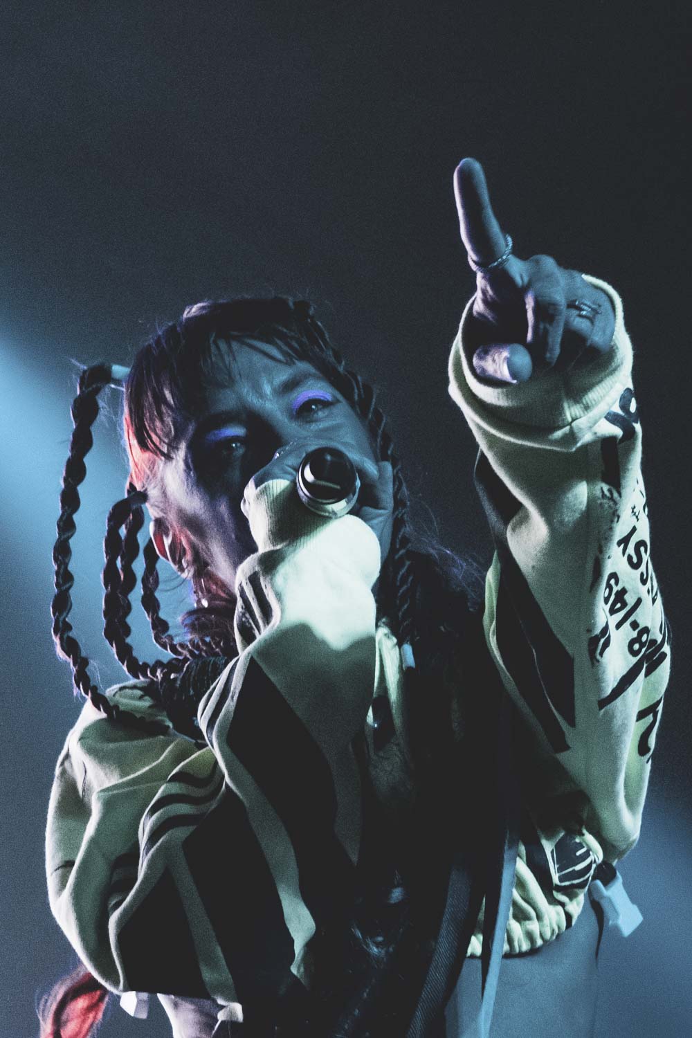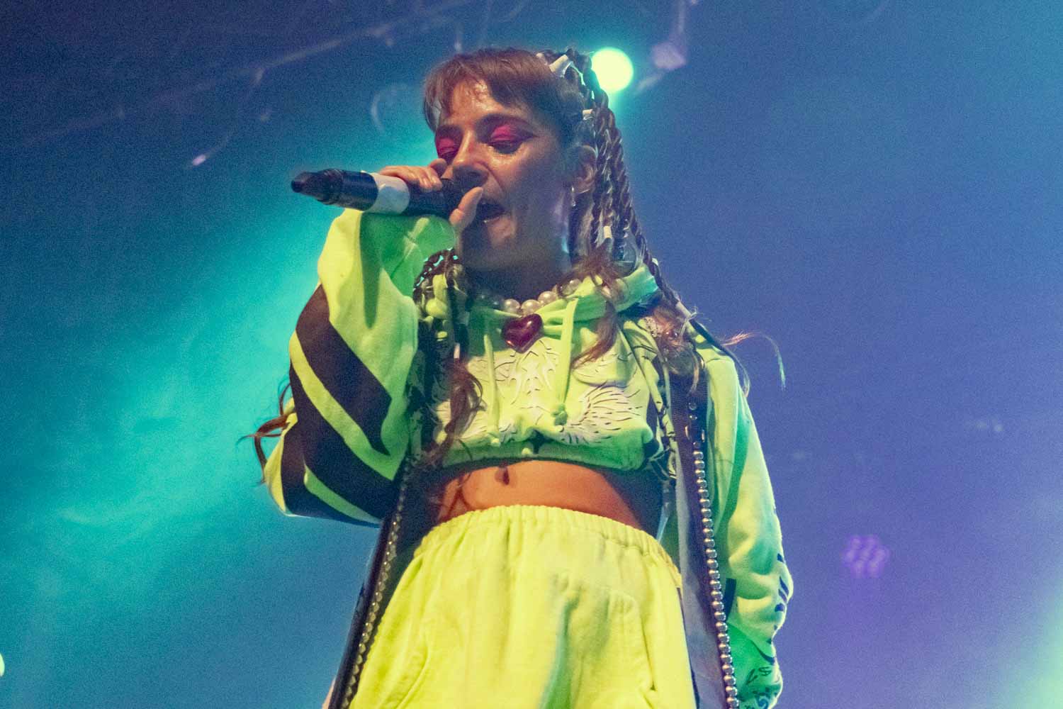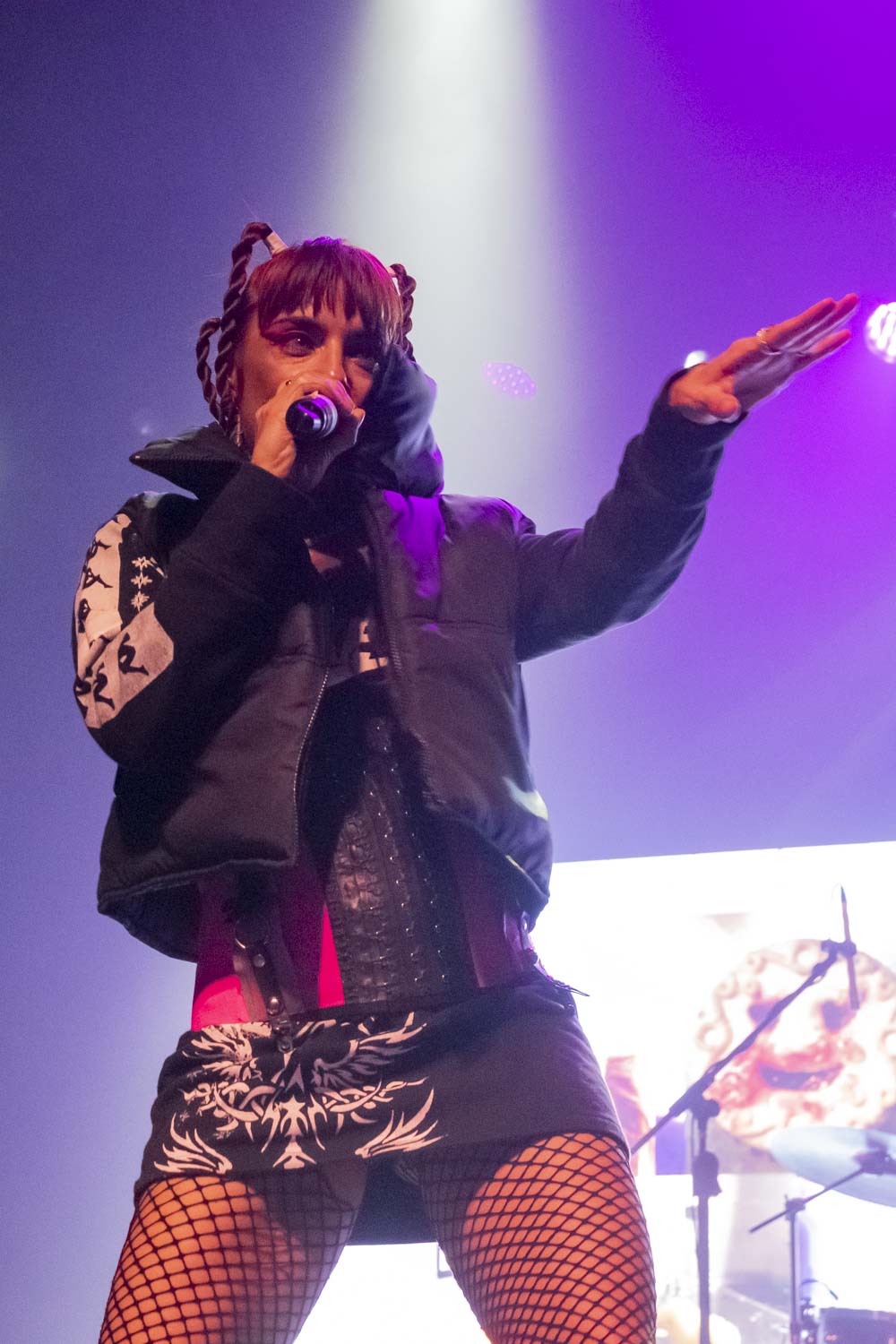 Pasadas las 22hs Sara Hebe y su banda aparecieron en escena. La primera parte de show fue la presencia de su más reciente trabajo: canciones urbanas con una amalgama de ritmos que van del rock más furibundo al trap más intenso con perreo incluido. Sara baila, canta, arenga a todo el público y deja