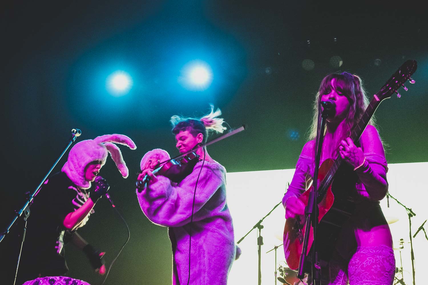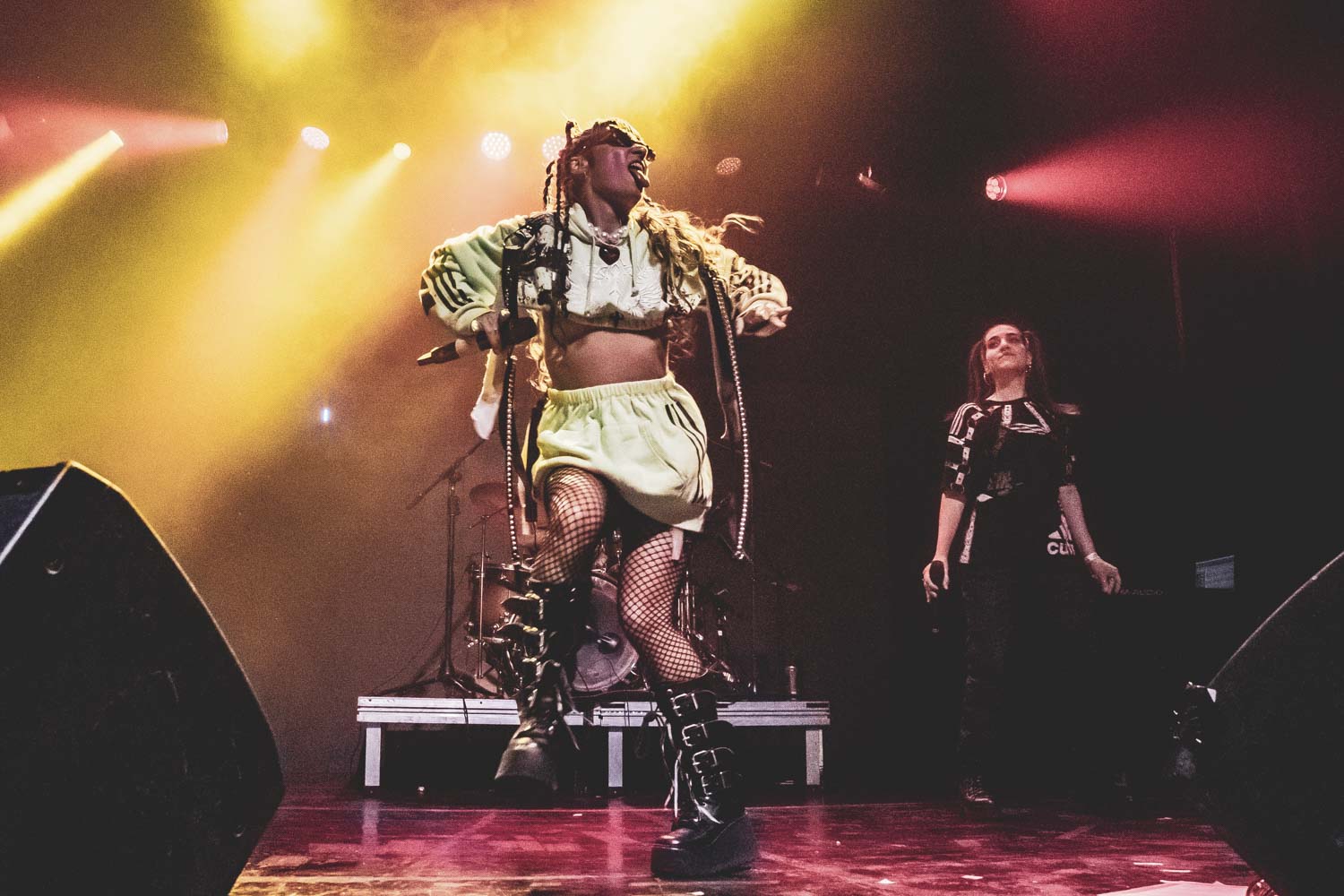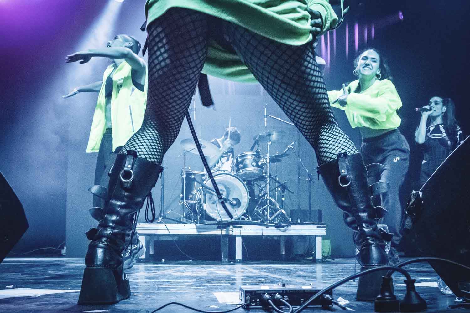 Pasadas las 22hs Sara Hebe y su banda aparecieron en escena. La primera parte de show fue la presencia de su más reciente trabajo: canciones urbanas con una amalgama de ritmos que van del rock más furibundo al trap más intenso con perreo incluido. Sara baila, canta, arenga a todo el público y deja