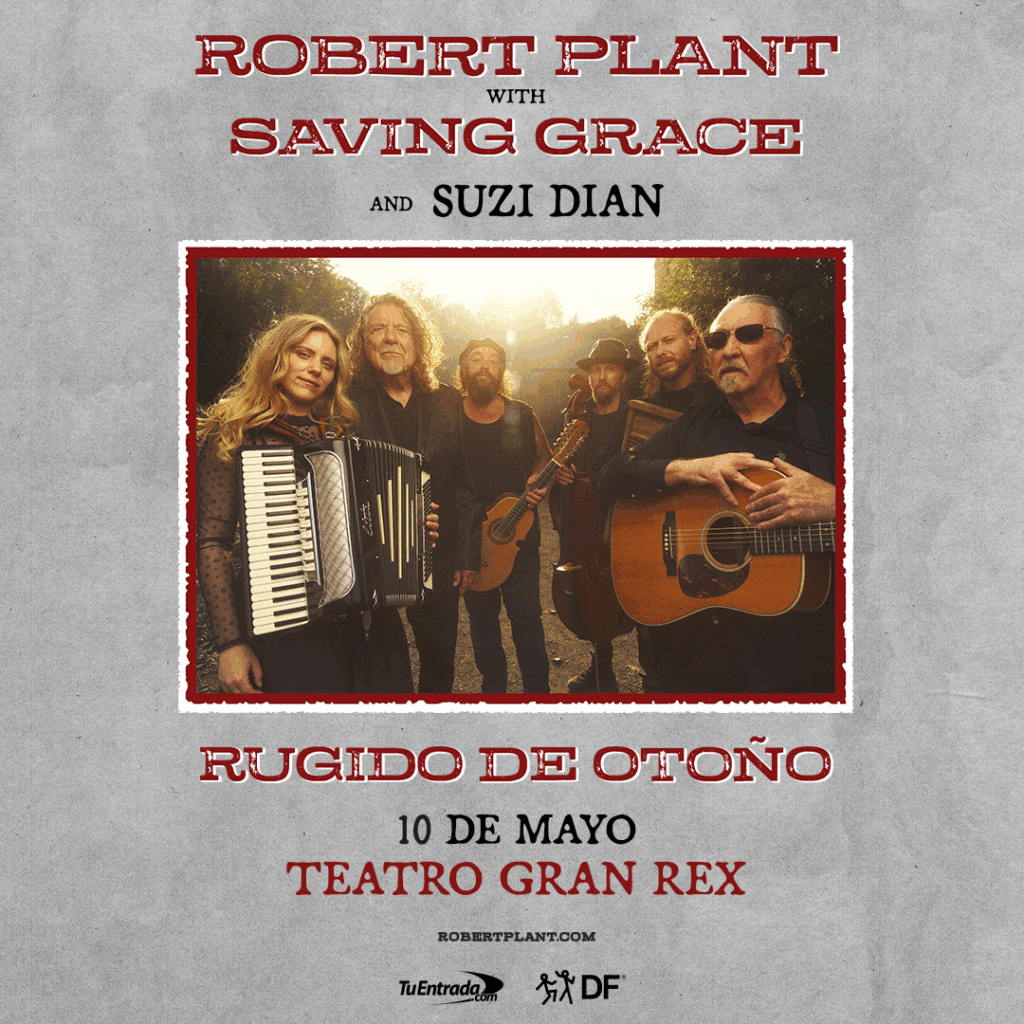 Robert Plant, frontman de la legendaria banda Led Zeppelin y uno de los artistas más influyentes en la historia del rock, regresa a Buenos Aires con “RUGIDO DE OTOÑO”, el tour con el que presentará su nuevo álbum “Saving Grace”. Acompañado por la cantante Suzi Dian y una banda de músicos excepcionales —el baterista Oli Jefferson, el guitarrista Tony Kelsey, el bajista y músico de cuerdas Matt Worley, y el violonchelista Barney Morse-Brown—, Plant ofrecerá un show íntimo e imperdible en el Teatro Gran Rex el 10 de mayo de 2026.
