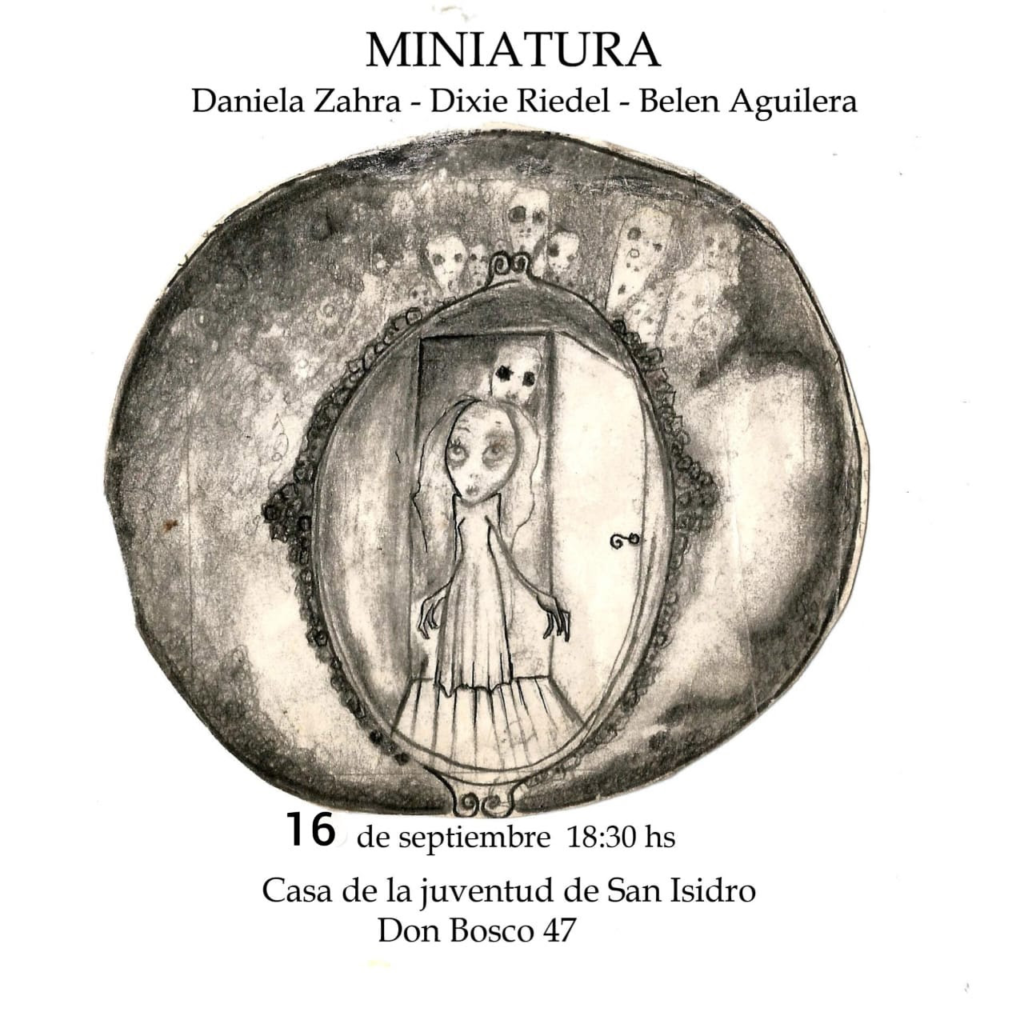 Criaturas oscuras y hermosas, niñas pálidas y etéreas, seres frágiles que habitan la penumbra de un mundo entre onírico y cercano. Ellas y ellos protagonizan las obras de Daniela Zahra, Dixie Riedel, y Belén Aguilera, que se pueden encontrar en la muestra MINIATURA, del 16 de agosto al 13 de octubre en Don Bosco 47, San Isidro.