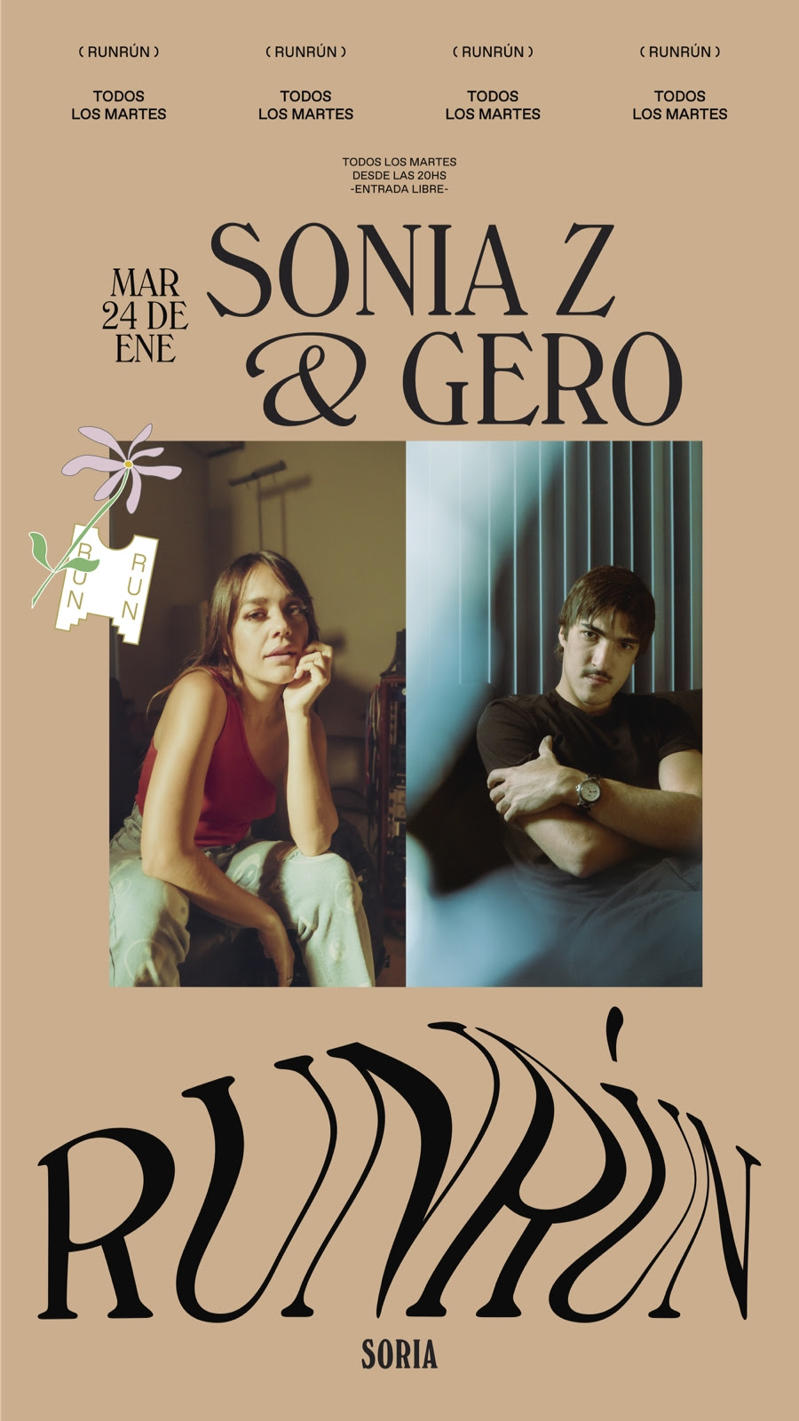 Sonia Z y Gero se estarán presentando en Soria Bar (Gorriti 5151, Palermo) este Martes 24 de Enero a las 20 horas con entrada libre y gratuita en el marco del Ciclo RUNRÚN, presentando versiones acústicas e inéditas de sus canciones.
