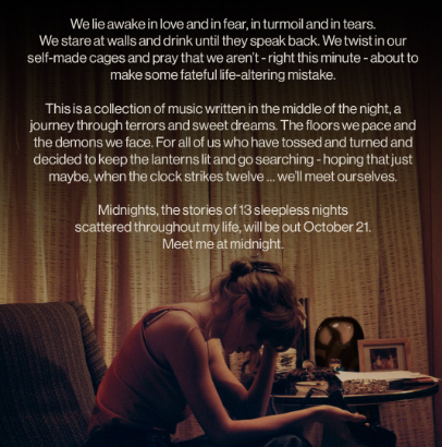 Esta es una colección de música escrita en medio de la noche, un viaje a través de terror y dulces sueños. Los suelos que pisamos y los demonios a los que nos enfrentamos. Para todos los que hemos dado vueltas en la cama y hemos decidido mantener las linternas encendidas e ir en busca, esperando que tal vez, cuando el reloj dé las doce… nos encontremos a nosotros mismos»‘Midnights’, la historia de 13 noches de insomnio esparcidas a lo largo de mi vida, estará disponible el 21 de octubre. Encuéntrame a la medianoche».
