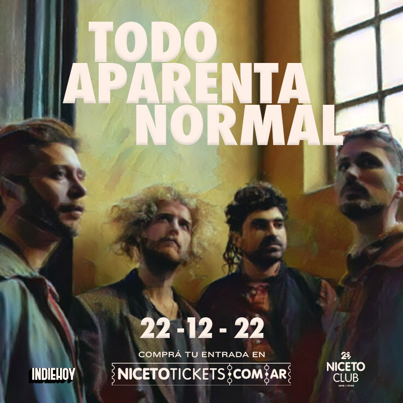 Tras agotar su último show en Niceto Club y a punto de lanzar nuevo disco, Todo Aparenta Normal vuelve para cerrar el 2022 con una noche épica llena de música y canciones de todo su repertorio. Será una función única con invitadxs especiales. La cita será el jueves 22 de diciembre en Niceto Club.