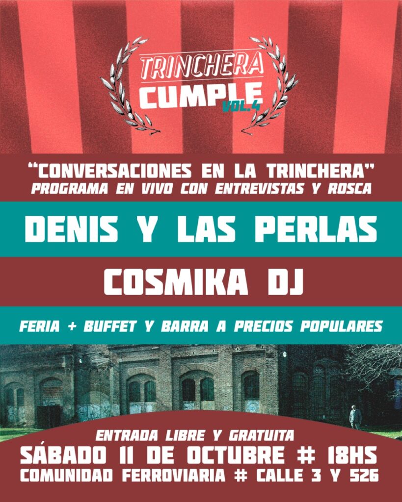 Este sábado 11 de octubre, a partir de las 18 horas, celebramos un nuevo cumpleaños de Trinchera. Los cuatro años de Radio Trinchera y los trece años de la revista los festejamos a lo grande en la Comunidad Ferroviaria de Tolosa (ubicada en 3 y 526).