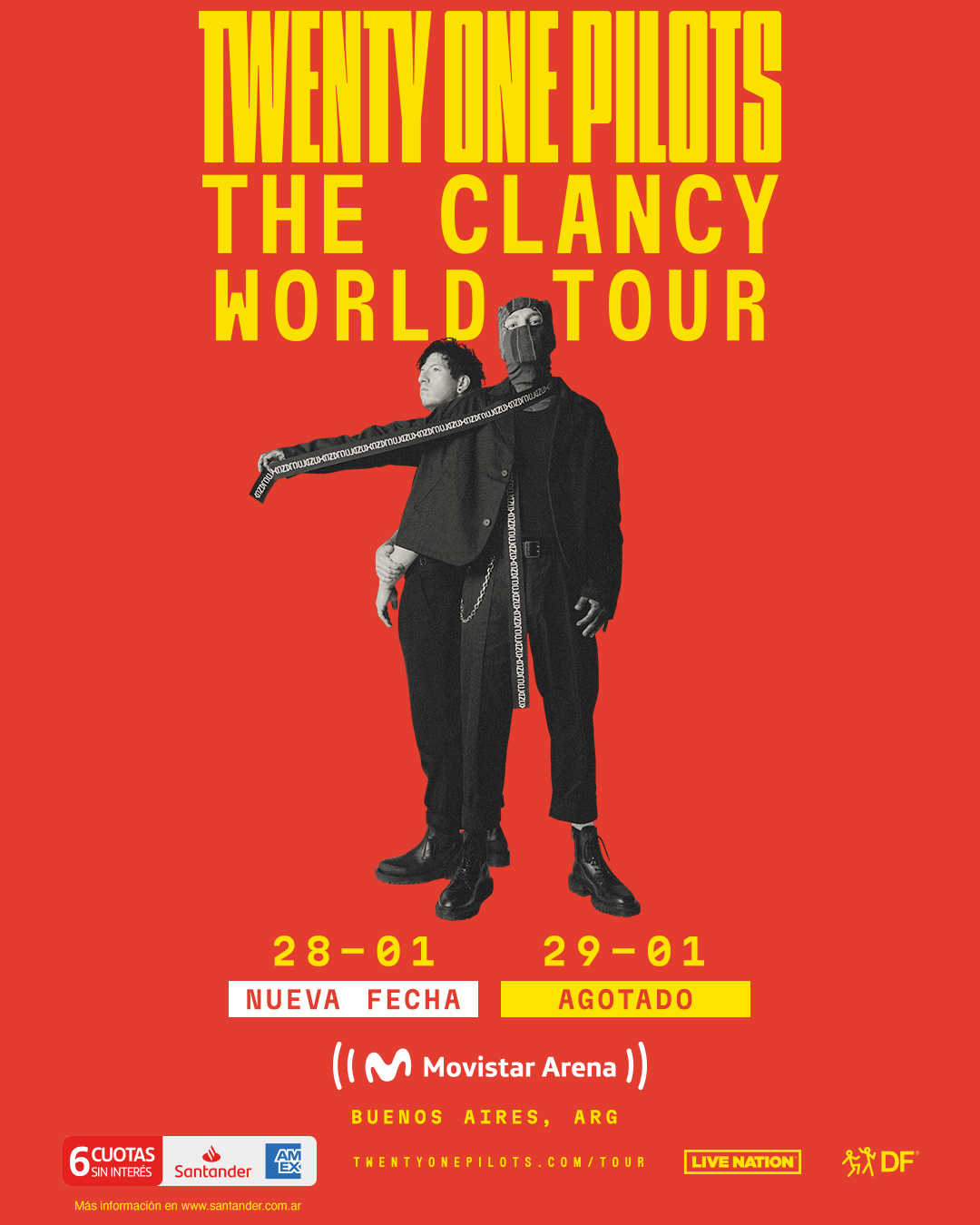 El pasado mes de mayo, la noticia de la llegada del “The Clancy World Tour” a la Argentina con producción de DF Entertainment revolucionó a los fanáticos de Twenty One Pilots, que agotaron las entradas para la cita del 29 de enero tiempo record. Tras meses de espera, el dúo oriundo de Ohio suma una segunda y última presentación en Buenos Aires, el 28 de enero de 2025, también en el Movistar Arena.
