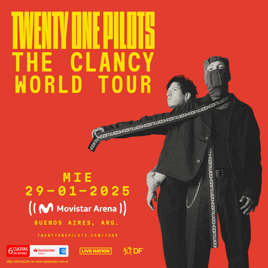 El dúo multipremiado de Josh Dun y Tyler Joseph, que han redefinido el sonido para toda una generación, viene de anunciar la gira mundial más importante en la historia de Twenty One Pilots: “The Clancy World Tour”, y confirma su presentación en Argentina el 29 de enero de 2025, en el estadio Movistar Arena, con producción de DF Entertainment. Las entradas se podrán adquirir la semana que viene únicamente a través de Movistar Arena, según el siguiente calendario: