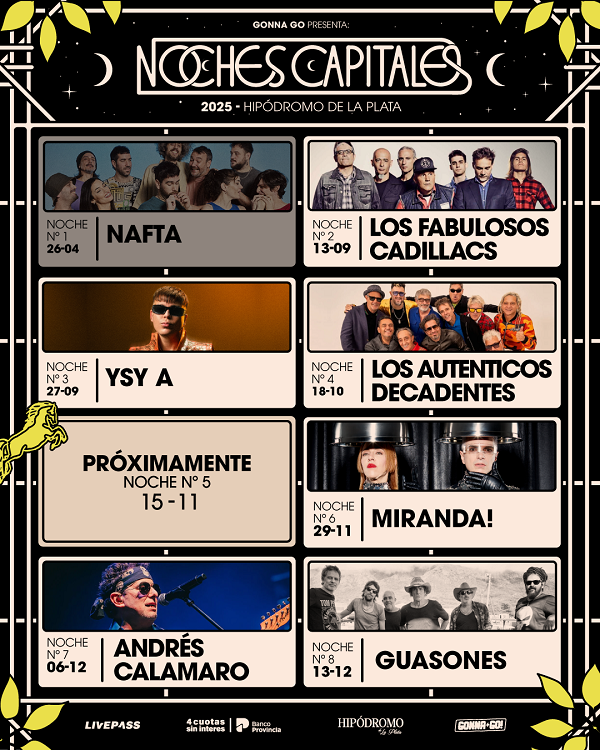 La grilla ya es monumental: Los Fabulosos Cadillacs el 23 de septiembre, Los Auténticos Decadentes el 18 de octubre, Miranda! el 29 de noviembre, Andrés Calamaro el 6 de diciembre y Guasones el 13 de diciembre, la expectativa continúa creciendo más firme que nunca con el explosivo anuncio de YSY A el 27 de septiembre. Talentosos y consagrados músicos que se encuentran celebrando trayectorias, estrenando materiales y marcando el pulso de la escena artística.